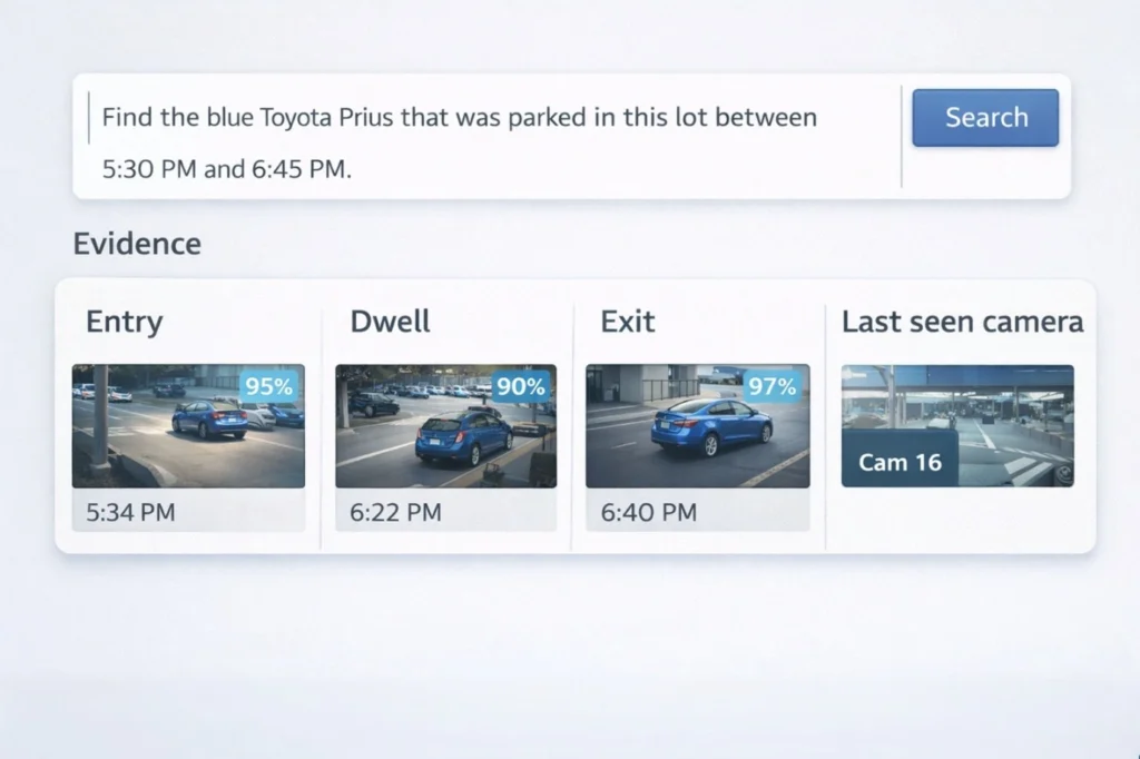 Within seconds, the exact clips appear. The vehicle entering the lot. The point at which it leaves. The route it takes. No manual scrubbing. No guesswork. Just answers.