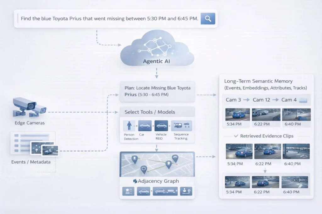 Public surveillance incidents rarely stay within a single camera feed. Vehicles move across zones, blind spots, and multiple timelines. That’s why Agentic AI must live in the cloud, where it can maintain global context using a camera topology graph (coverage overlap, adjacency, handoff paths) and long-horizon incident timelines.