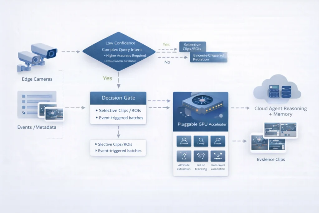 Rather than treating GPU compute as an always-on requirement, agentic surveillance architectures use it selectively. The near edge layer can be activated based on incident complexity, query intent, and confidence thresholds allowing the system to scale precision without scaling cost linearly across every camera.
