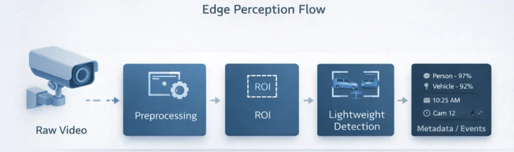 In other words, the camera does not attempt to perform deep multi-model reasoning. Instead, it converts raw video into structured perception signals, events and metadata that can be transmitted efficiently to higher layers.