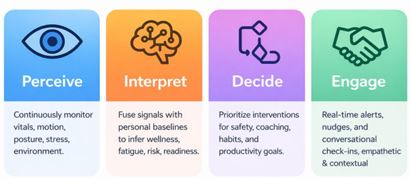 - Perceive: Continuously monitor vitals, motion, posture, stress, environment.