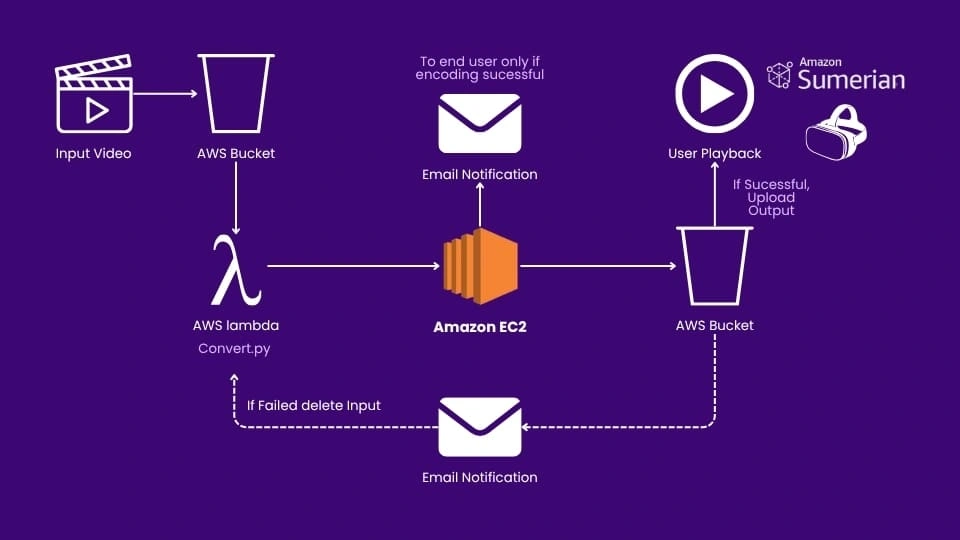 In the flow diagram of a Virtual Reality solution, the user uploads the video to the Watch Folder of the bucket in AWS S3. The multipart upload complete event will trigger the lambda function, which starts the EC2 instance. Encoding will then be performed through FFmpeg to encode output with the AV1 codec. If encoding is successful, then only the encoded file will be uploaded to the “output” directory in the AWS S3 bucket. If encoding is failed, then the input media file will be deleted from the “input” directory of AWS S3. The content provider will receive an email notification for failure or success of encoding job, using AWS SNS service. AWS SNS will trigger further AWS Lambda function and Lambda will stop the AWS EC2 instance. Lambda will also check whether the trigger is for output file upload or not, if yes, then it will send an email notification to the end user, using AWS SES service, to notify new content’s availability. Further AWS S3 output file link can be integrated into AWS Sumerian, to view it using VR set, in 3D scene mode. Python3 can be used for entire automation scripts.