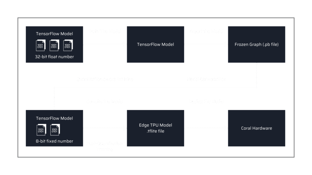 For a quick summary, TensorFlow Lite is a lightweight version of TensorFlow specially designed for mobile and embedded devices. It achieves low latency results with a small storage size. There is a TensorFlow Lite converter that allows converting a TensorFlow-based AI model file (. pb) to a TensorFlow Lite file (.tflite). Below is a standard workflow for deploying applications on Edge TPU