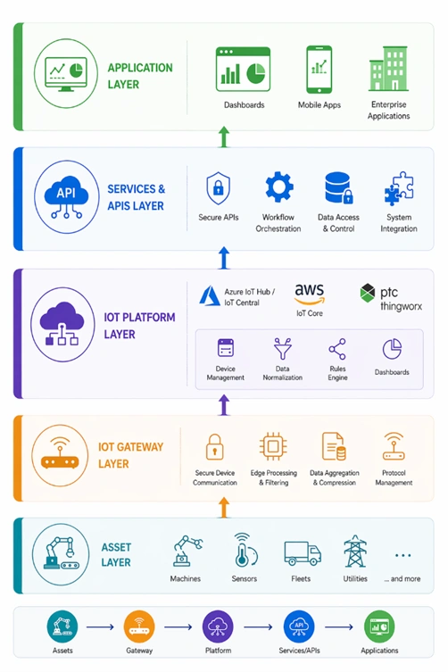 This layered approach ensures that data flows smoothly from machines to meaningful business insights, without complexity.
