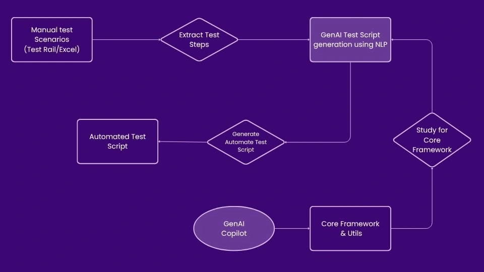 GenAI enhances Test Automation frameworks by leveraging advanced machine learning models to streamline and optimize the entire testing lifecycle. GenAI can automatically generate test scripts by analyzing code, user behavior, and historical data, significantly reducing the time and manual effort required to create and maintain tests. It uses Natural Language Processing (NLP) to convert plain English test cases into executable scripts, making test creation accessible even for non-technical users. Furthermore, GenAI’s self-healing capabilities enable frameworks to automatically update broken locators and adapt to UI changes, minimizing maintenance overhead.