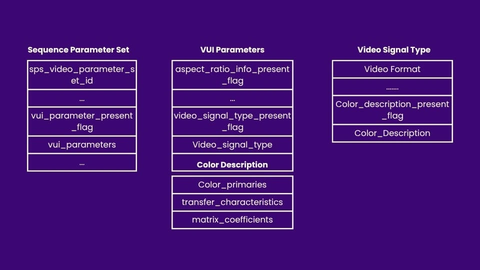 HDR10 utilizes the PQ EOTF, BT2020 WCG, and ST2086 + Max FALL + Max CLL static metadata. The HDR10 metadata structure follows the ITU Series H Supplement 18 standard for HDR and Wide Color Gamut (WCG). There are three HDR10-related Video Usability Information (VUI) parameters: color primaries, transfer characteristics, and matrix coefficients. This VUI metadata is contained in the Sequence Parameter Set (SPS) of the intra-coded frames.