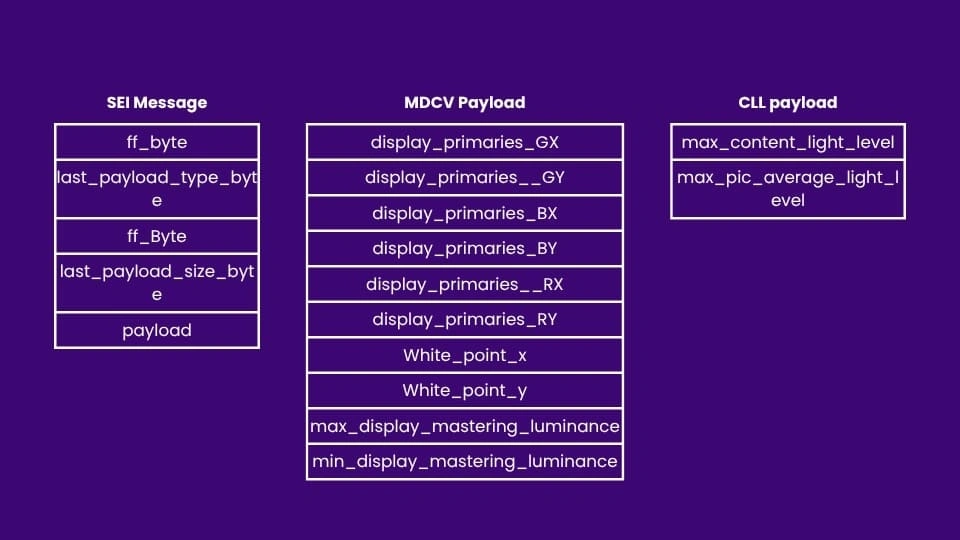 In addition to the VUI parameters, there are two HDR10-related Supplemental Enhancement Information (SEI) messages. Mastering Display Color Volume (MDCV) and Content Light Level (CLL).