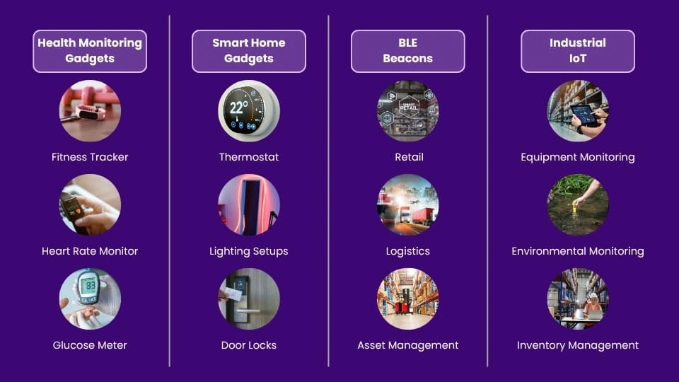 - Smart Home Automation: BLE is employed in smart home gadgets such as thermostats, lighting setups, door locks, and sensors. The capability of linking numerous devices to one central hub or mobile application allows for effortless supervision and management while maintaining low power usage to ensure the longevity of battery-operated devices.