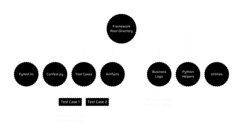 As shown above in the structure, the business logic of the framework core components is completely independent of Pytest components. Pytest makes use of the core framework just like instantiating the objects and calling its functions in the test script. Test script file name should either start with `test_` or end with `_test`. The test function name should also be in the same format. Reporting in Pytest can be taken care of by Pytest-html reporting.
