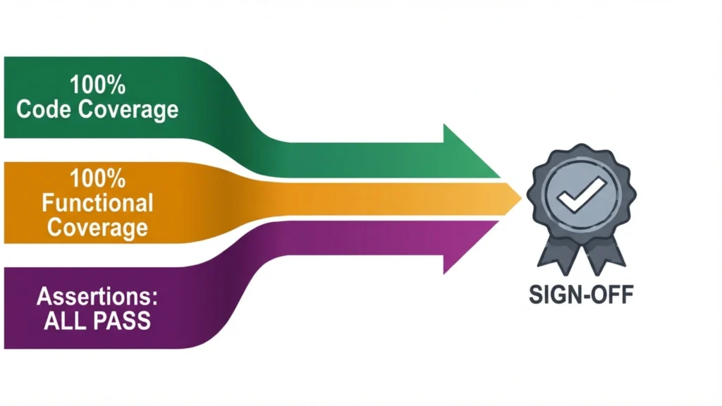 Closure is determined by measurable verification results aligned to architectural intent, not by regression pass counts or test volume. Verification artifacts, coverage data, and identified limitations are reviewed as part of formal sign-off. At this stage, any remaining functional risk is explicitly understood, documented, and accepted based on objective evidence.