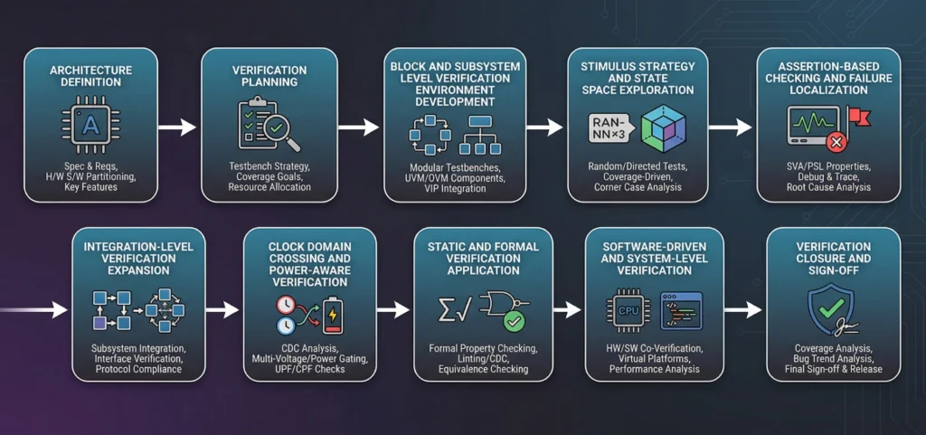 The flow begins with the definition and verification planning of architectural intent, progresses through block and subsystem-level verification, expands to full-chip and power-aware validation, and concludes with system-level and software-driven verification. Closure is achieved only when coverage goals defined in the verification plan are satisfied across all operating modes and configurations.